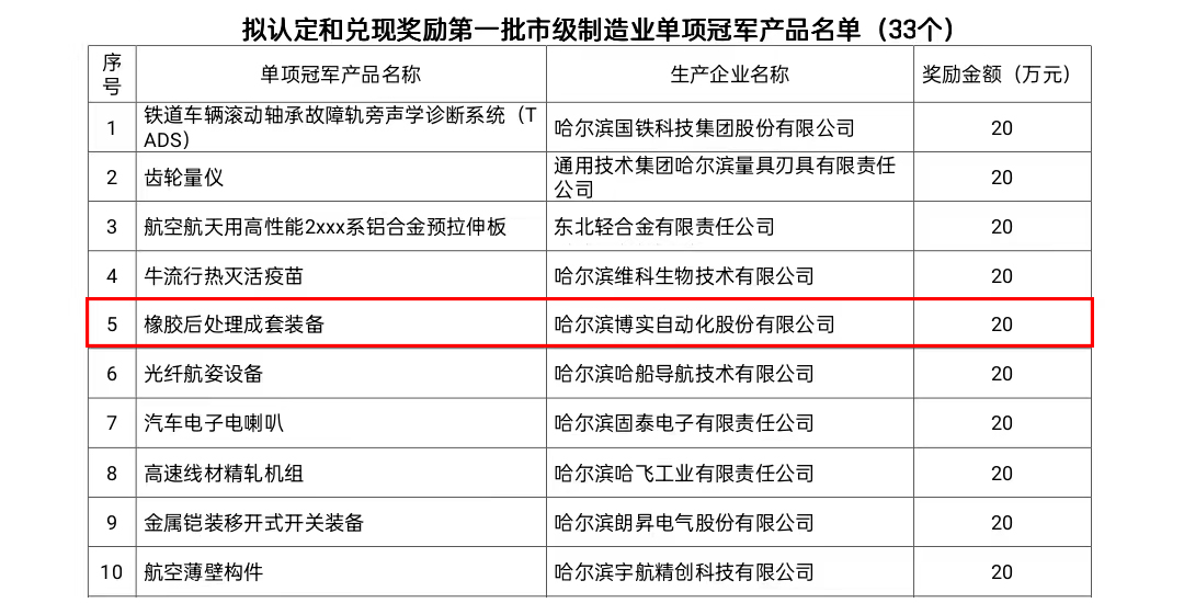 為鼓勵企業(yè)專注特定細分產品市場,按照《哈爾濱市制造業(yè)單項冠軍示范企業(yè)及產品遴選辦法(試行)》(哈工信規(guī)〔2021〕18號)規(guī)定,經(jīng)企業(yè)申報、屬地推薦、專家論證,擬認定46戶企業(yè)為哈爾濱市第一批市級制造業(yè)單項冠軍企業(yè)、33個產品為哈爾濱市第一批市級制造業(yè)單項冠軍產品,并根據(jù)《哈爾濱市人民政府印發(fā)關于加快推動哈爾濱市制造業(yè)高質量發(fā)展實現(xiàn)工業(yè)強市若干政策措施的通知》(哈政規(guī)〔2021〕10號)和《哈爾濱市工業(yè)和信息化局關于印發(fā)加快培育制造業(yè)優(yōu)質企業(yè)及工業(yè)設計載體扶持計劃實施細則等4個文件的通知》(哈工信規(guī)〔2021〕18號),按照《哈爾濱市工業(yè)和信息化局加快培育制造業(yè)優(yōu)質企業(yè)及工業(yè)設計載體扶持計劃實施細則》第五條“對首次認定的哈爾濱市(市級)制造業(yè)單項冠軍企業(yè),給予一次性獎勵50萬元。對首次認定的哈爾濱市(市級)制造業(yè)單項冠軍產品的企業(yè),給予一次性獎勵20萬元”兌現(xiàn)政策獎勵資金。現(xiàn)將擬認定和兌現(xiàn)獎勵名單予以公示。