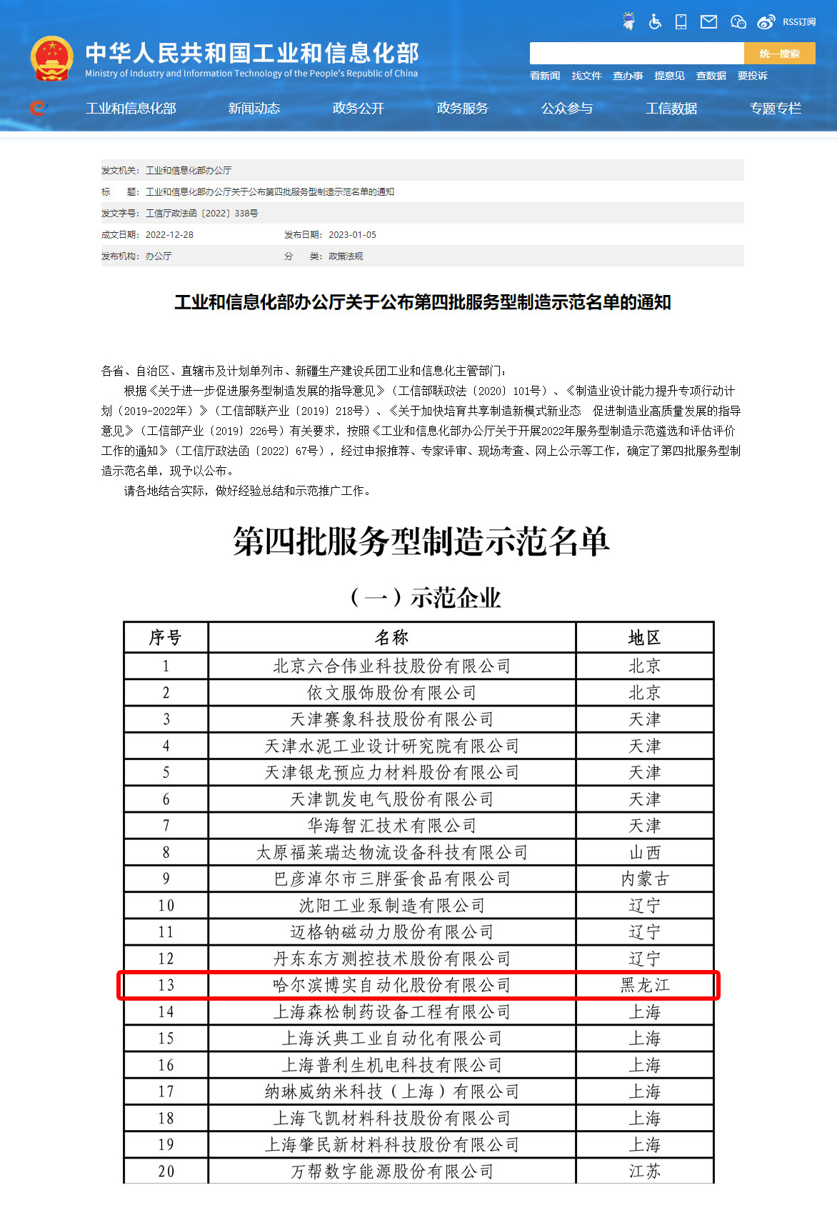 1月5日,國家工業(yè)和信息化部辦公廳正式公布“第四批服務(wù)型制造示范名單”,博實股份為黑龍江省唯一入選企業(yè)。